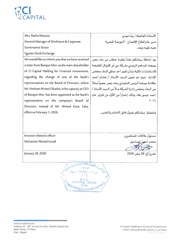 أعلنت شركة سي آي كابيتال القابضة للاستثمارات المالية، في بيان للبورصة المصرية اليوم، عن تلقيها خطابًا من بنك مصر بصفته المساهم الرئيسي بالشركة، بشأن تغيير أحد ممثلي البنك في مجلس إدارة الشركة.