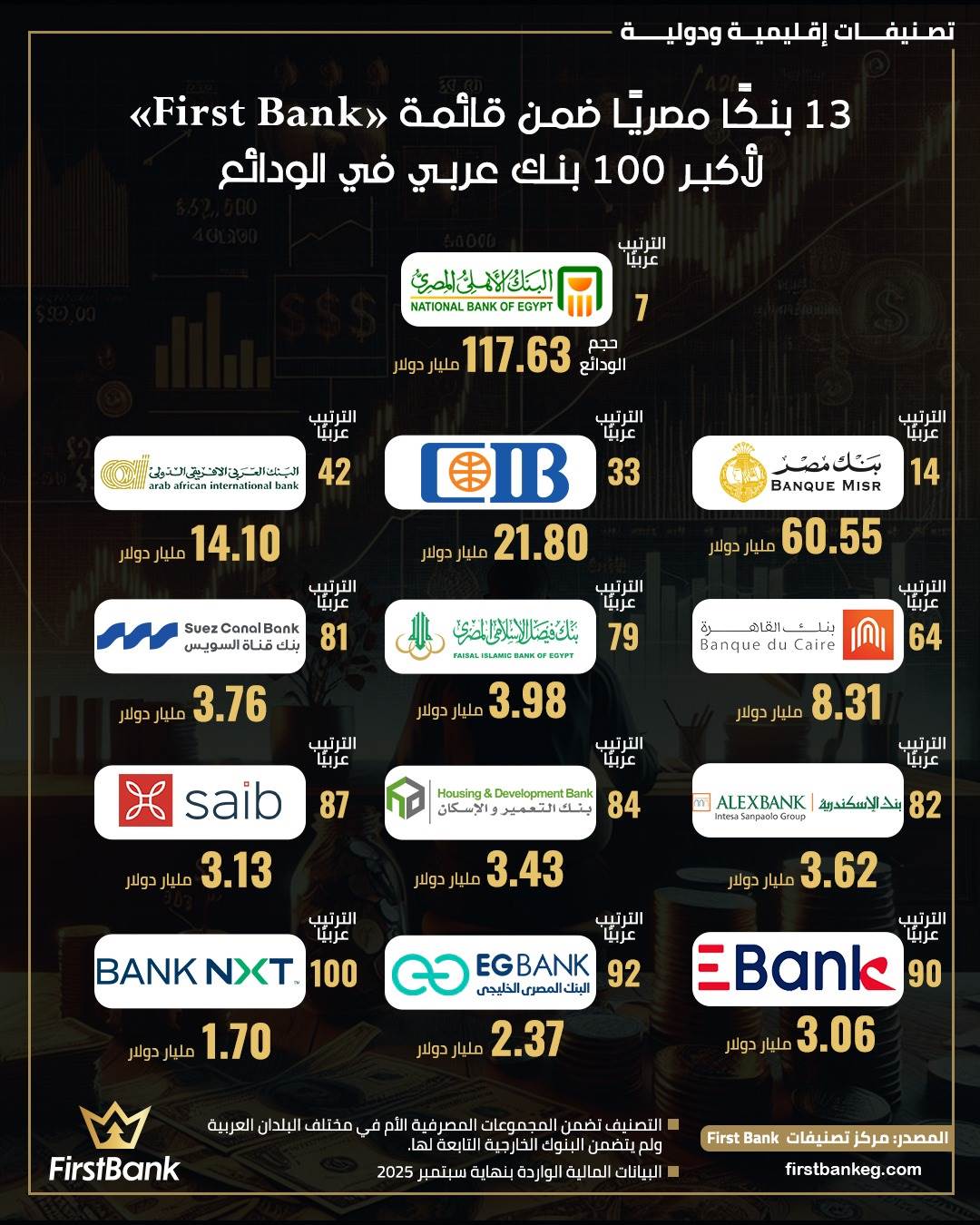 13 بنكًا مصريًا ضمن قائمة «First Bank» لأكبر 100 بنك عربي في الودائع بنهاية سبتمبر 2025