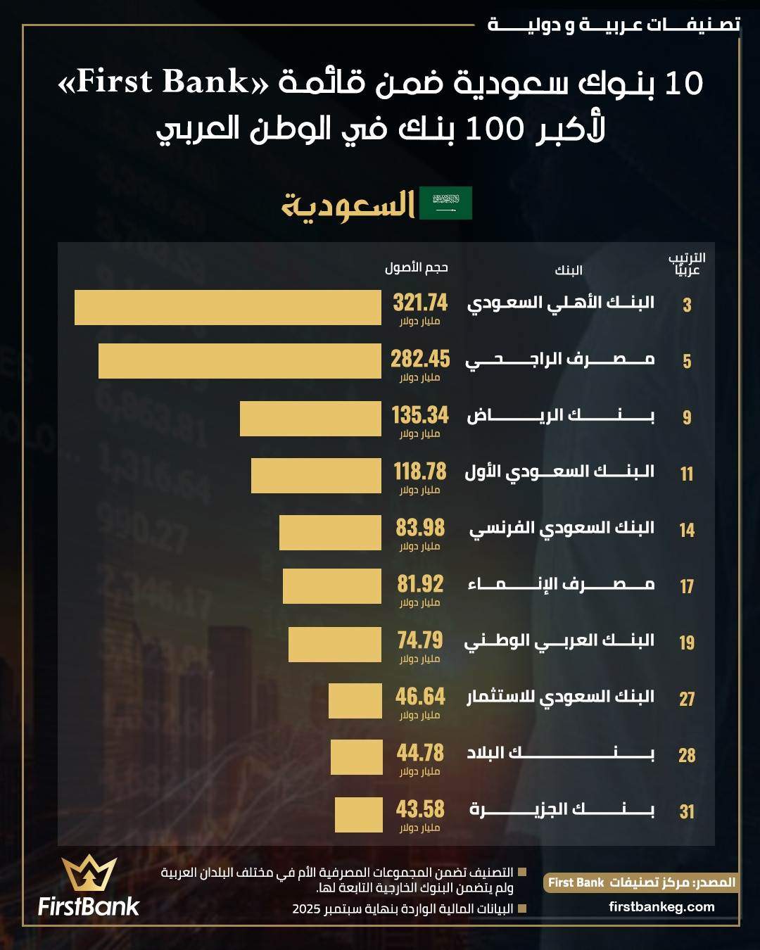 كشف تصنيف حديث أصدره «First Bank» لأكبر 100 بنك في الوطن العربي من حيث حجم الأصول بنهاية سبتمبر 2025، عن وجود 10 بنوك سعودية ضمن القائمة.