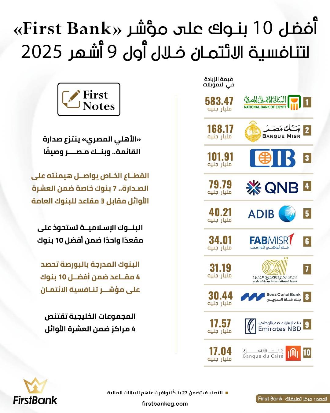 42089 /42089 أفضل 10 بنوك على مؤشر«First Bank» لتنافسية الائتمان خلال أول 9 أشهر 2025 مركز تصنيفات First Bank 03:32 م - الخميس 5 فبراير 2026 شارك شارك