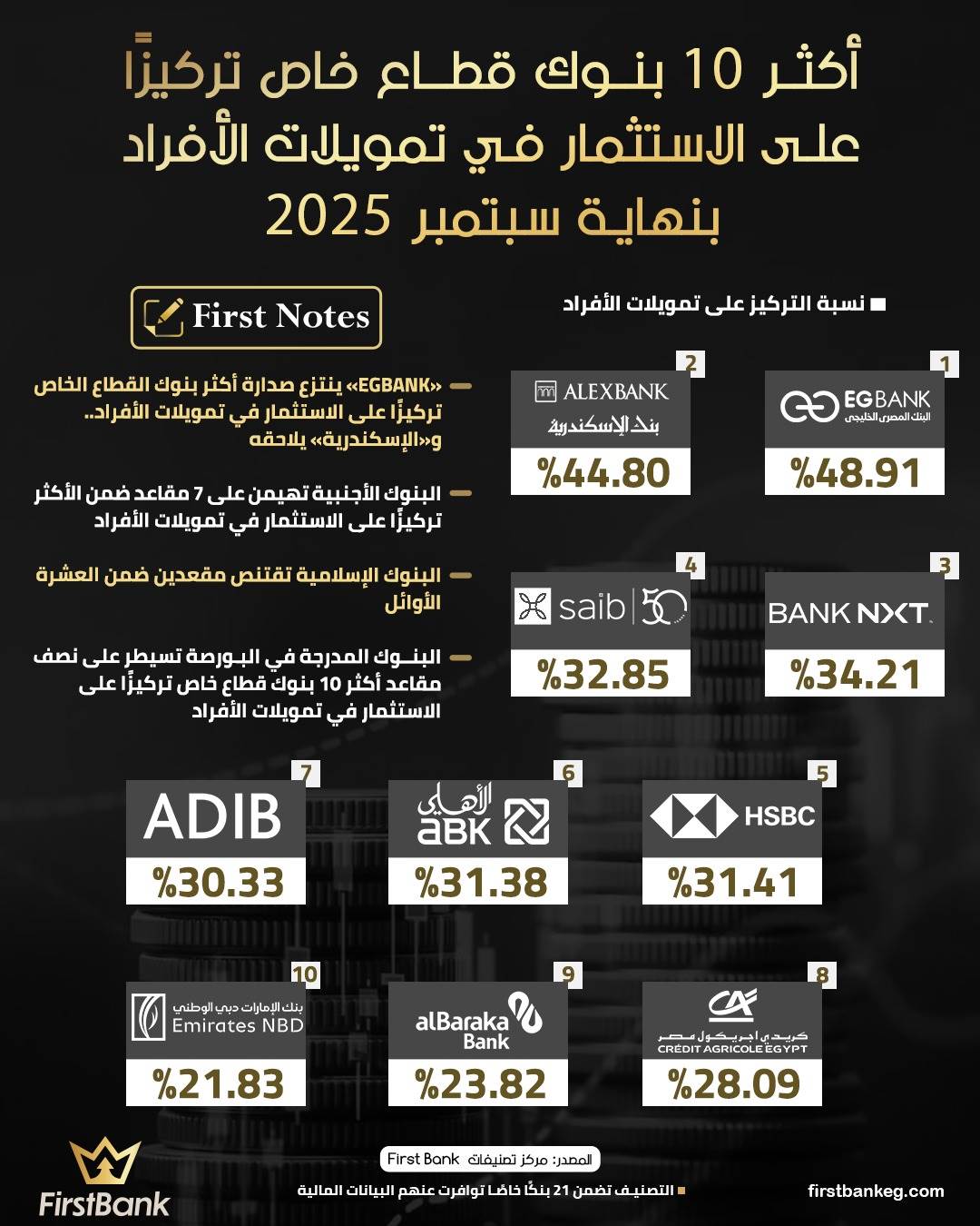 42121 /42121 أكثر 10 بنوك قطاع خاص تركيزاً على الاستثمار فى تمويلات الأفراد بنهاية سبتمبر 2025 مركز تصنيفات First Bank 01:42 م - الأحد 8 فبراير 2026 شارك شارك