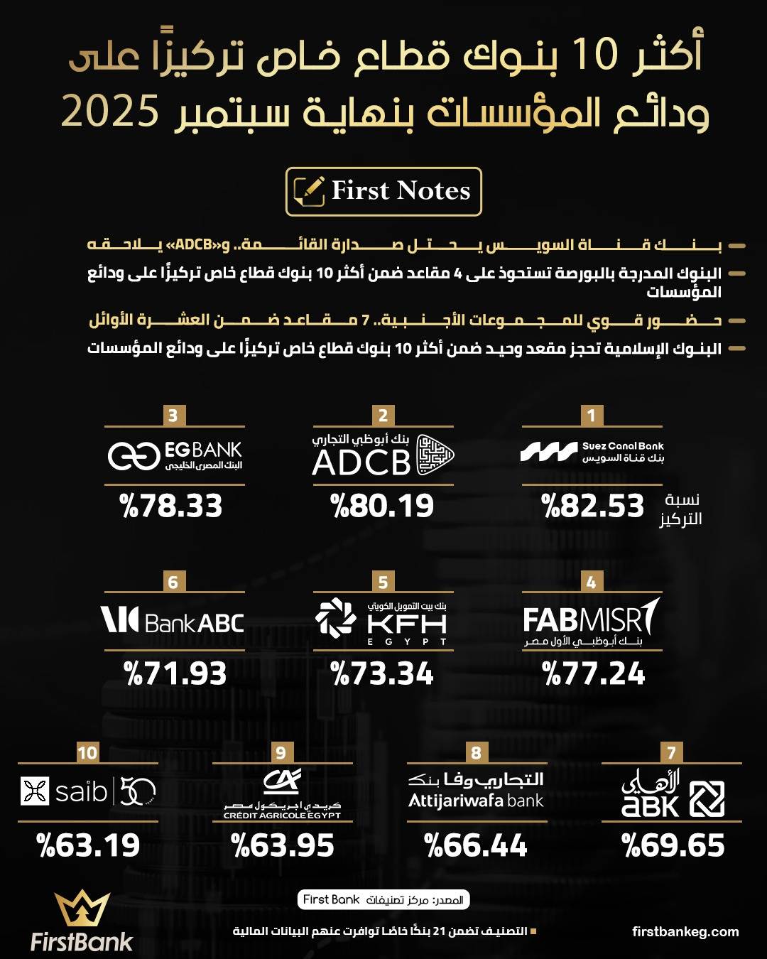 42220 /42220 أكثر 10 بنوك قطاع خاص تركيزًا على ودائع المؤسسات بنهاية سبتمبر 2025 مركز تصنيفات First Bank 01:45 م - الأربعاء 11 فبراير 2026 شارك شارك