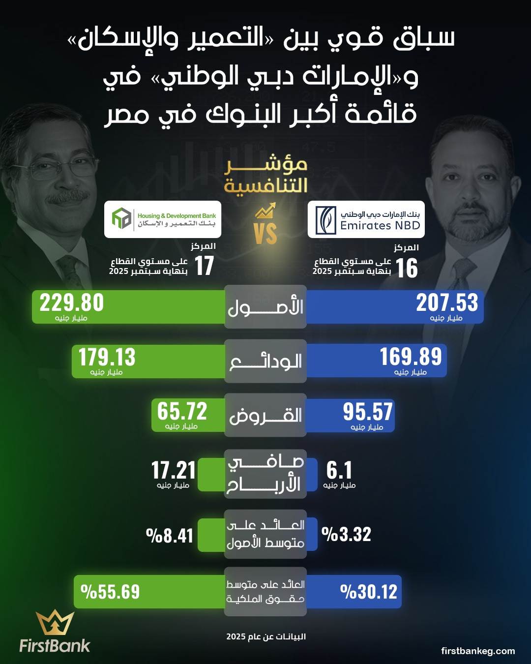 وتعكس المؤشرات المالية الأخيرة صورة تنافسية متوازنة ومعقدة بين بنك التعمير والإسكان وبنك الإمارات دبي الوطني – مصر، حيث يبرز تفوق بنك التعمير والإسكان في حجم المركز المالي وقاعدة الودائع ومستويات الربحية الحالية، فيما يواصل بنك الإمارات دبي الوطني – مصر قيادة نمو محفظة القروض بوتيرة أسرع، ما يعكس ديناميكية توسعية واضحة في نشاطه الائتماني.