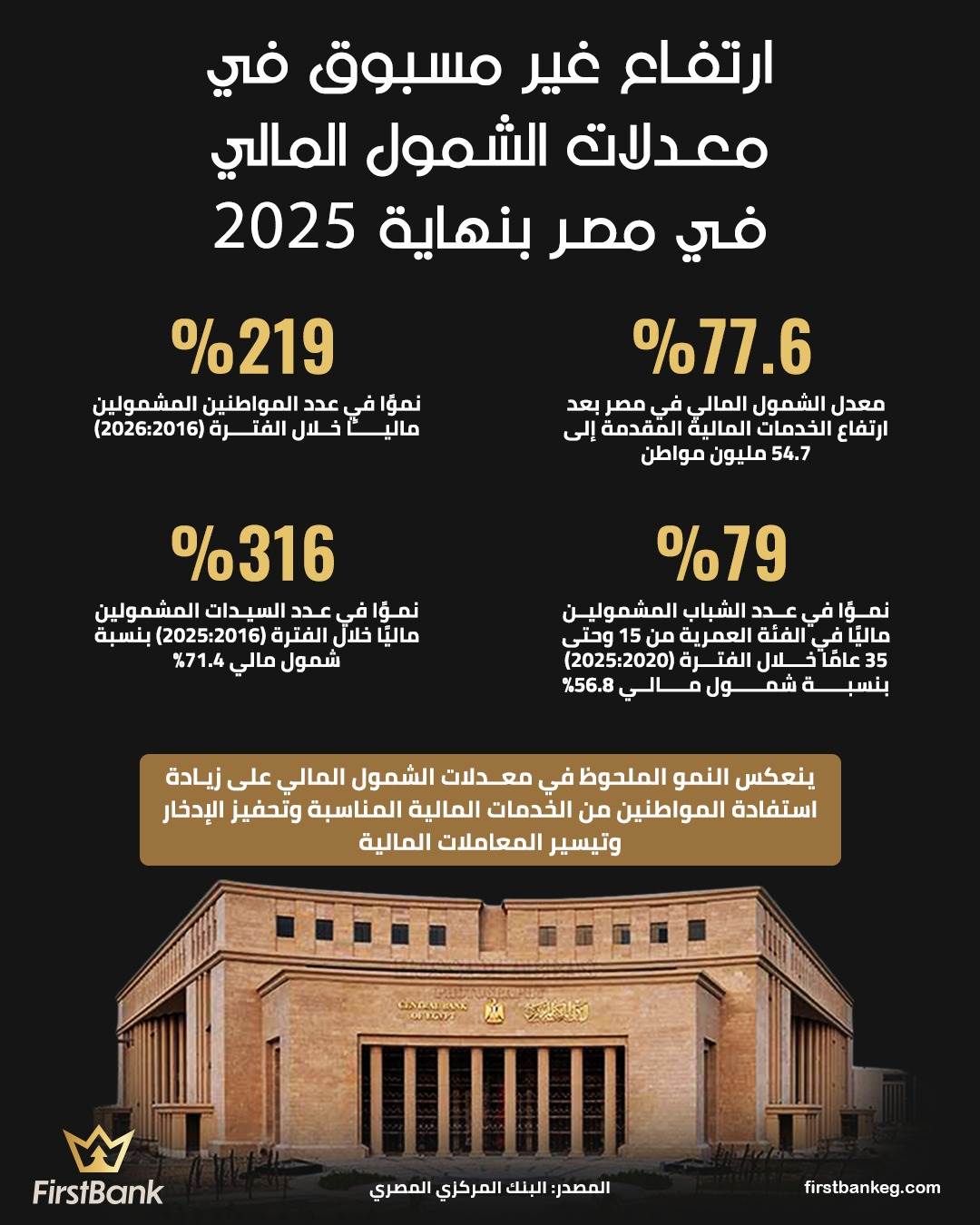 42390 /42390 ارتفاع غير مسبوق في معدلات الشمول المالي في مصر بنهاية 2025 فاطمة عطية 03:05 م - الأربعاء 18 فبراير 2026 شارك شارك