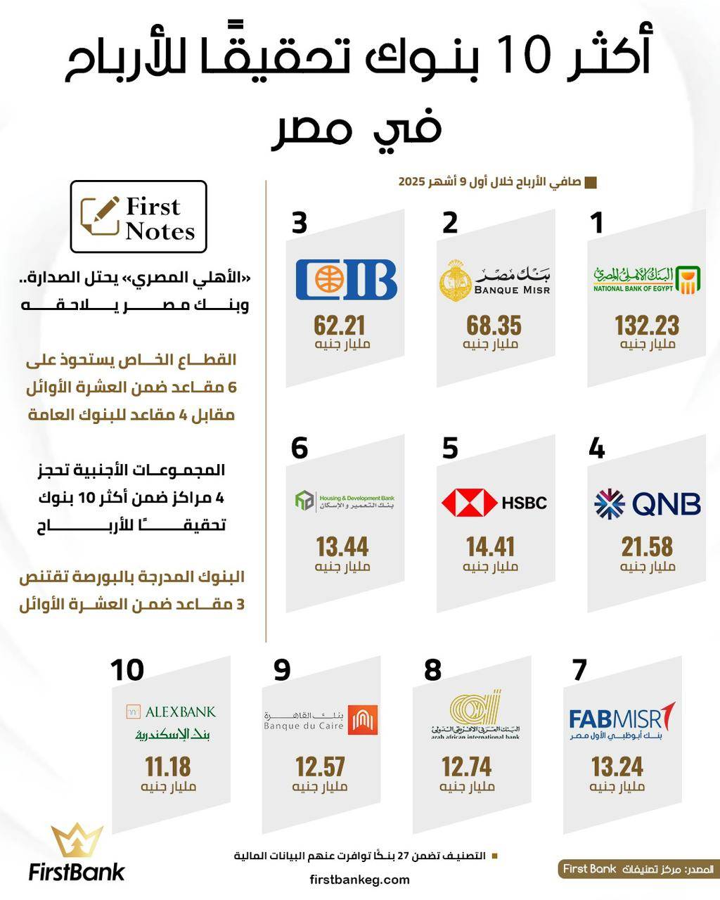 «الأهلي المصري» وبنك مصر و«CIB» أكثر البنوك تحقيقًا للأرباح خلال أول 9 أشهر 2025
