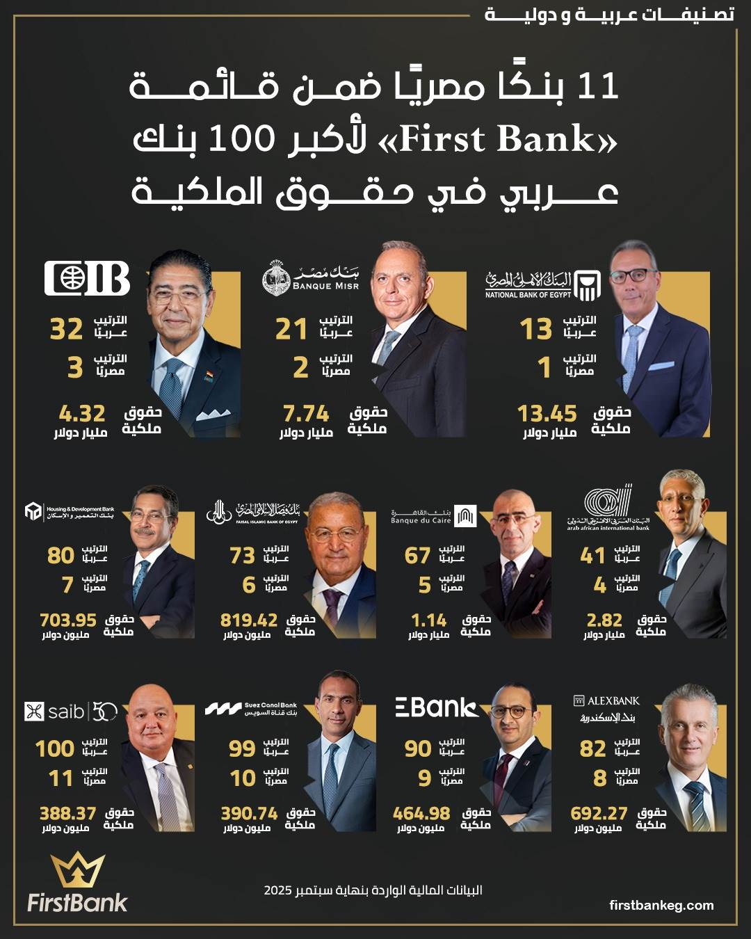 11 بنكًا مصريًا ضمن قائمة «First Bank» لأكبر 100 بنك عربي في حقوق الملكية بنهاية سبتمبر 2025