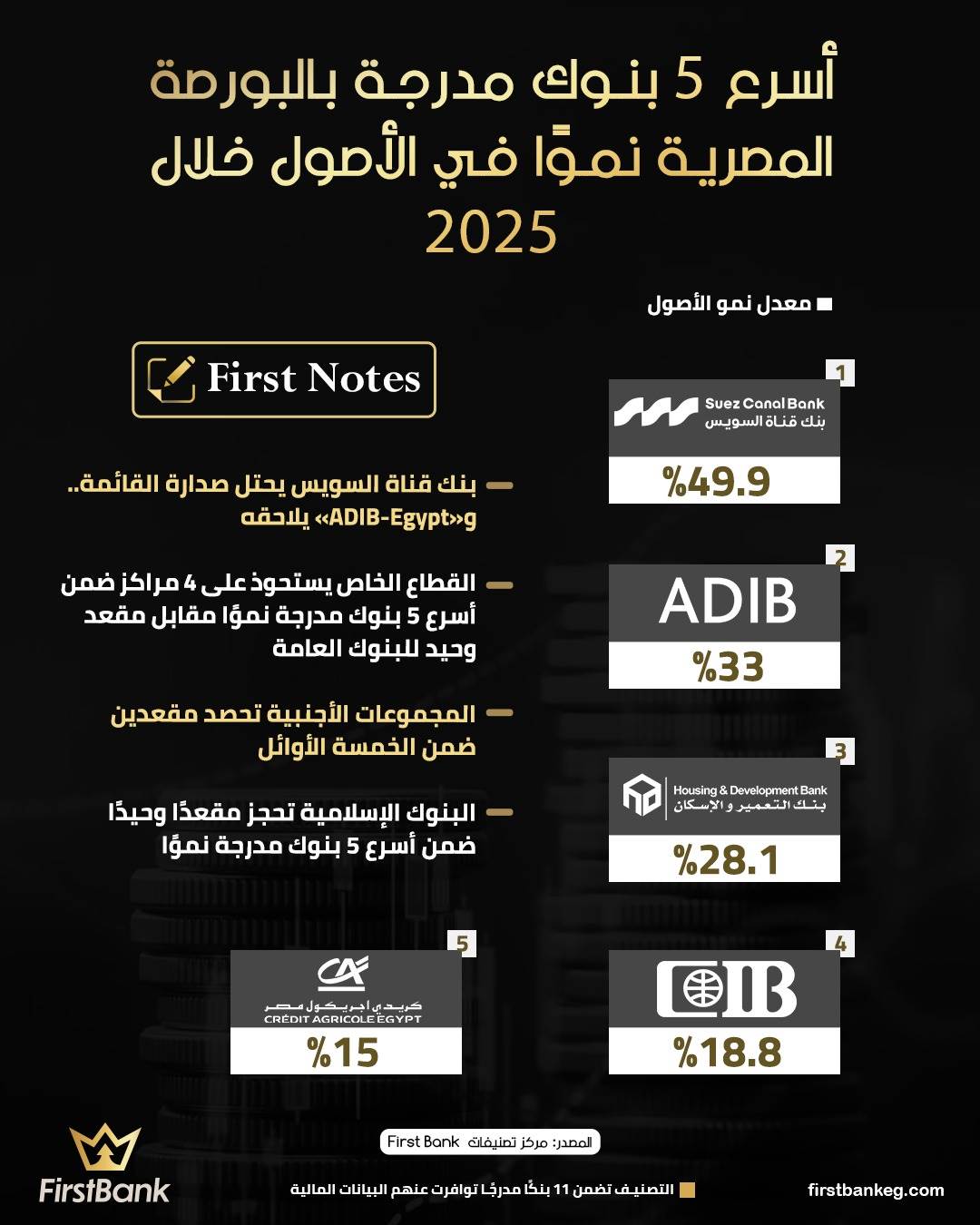 42532 /42532 أسرع 5 بنوك مدرجة بالبورصة المصرية نموًا في الأصول خلال 2025 First Bank 04:27 م - الثلاثاء 24 فبراير 2026 شارك شارك
