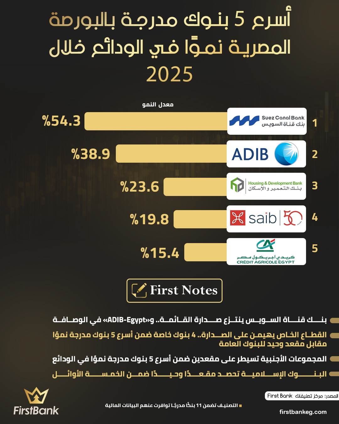 42546 /42546 أسرع 5 بنوك مدرجة بالبورصة المصرية نموًا في الودائع خلال 2025 11:44 ص - الأربعاء 25 فبراير 2026 شارك شارك