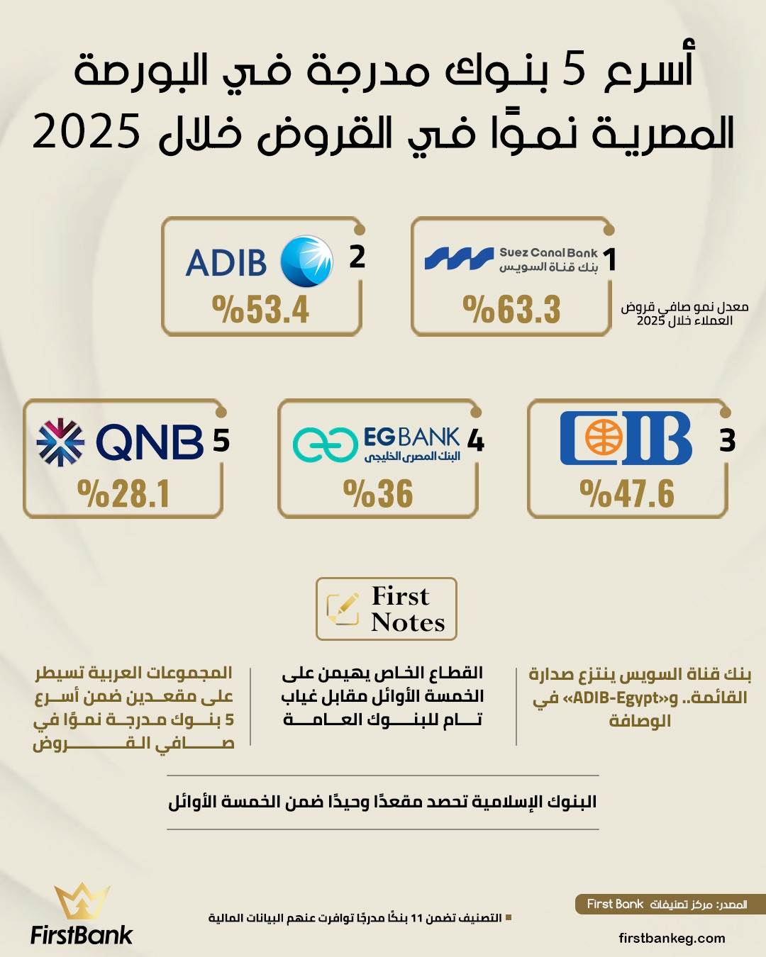 42560 /42560 أسرع 5 بنوك مدرجة في البورصة المصرية نمواً في القروض خلال 2025 مركز تصنيفات first bank 03:27 م - الأربعاء 25 فبراير 2026 شارك شارك