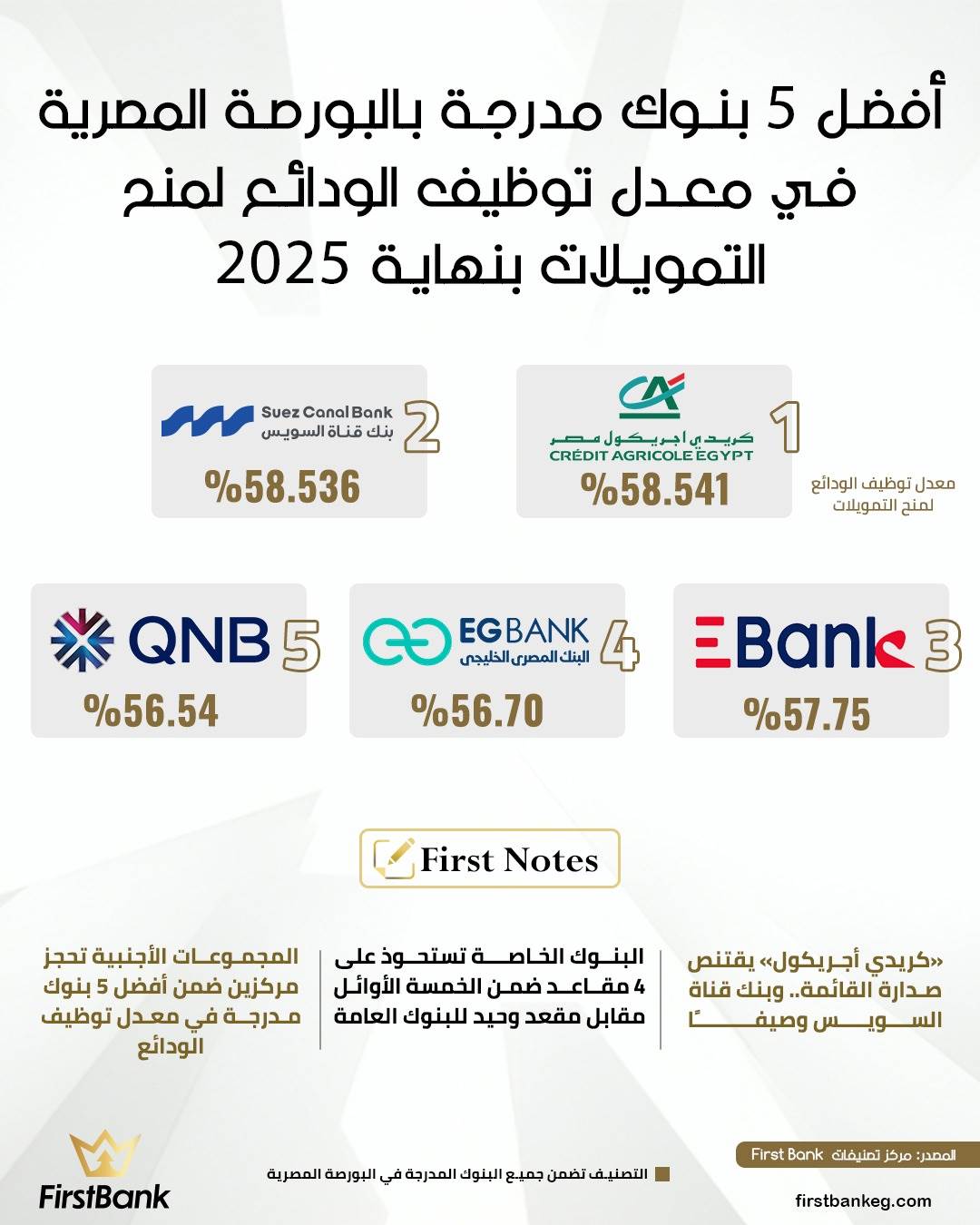 42924 /42924 أفضل 5 بنوك مدرجة بالبورصة المصرية فى معدل توظيف الودائع لمنح التمويلات بنهاية 2025 مركز تصنيفات first bank 02:25 م - الخميس 12 مارس 2026 شارك شارك