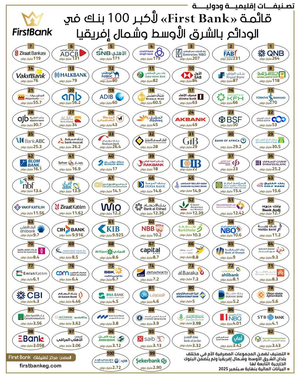 42926 /42926 قائمة «First Bank» لأكبر 100 بنك في الودائع بالشرق الأوسط وشمال إفريقيا 03:02 م - الخميس 12 مارس 2026 شارك شارك