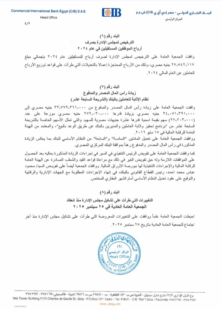 كما وافقت الجمعية العامة على تعديل المادتين السادسة والسابعة من النظام الأساسي للبنك بما يعكس الزيادة في رأس المال المصدر والمدفوع، وذلك رهنًا بالحصول على موافقة البنك المركزي المصري.