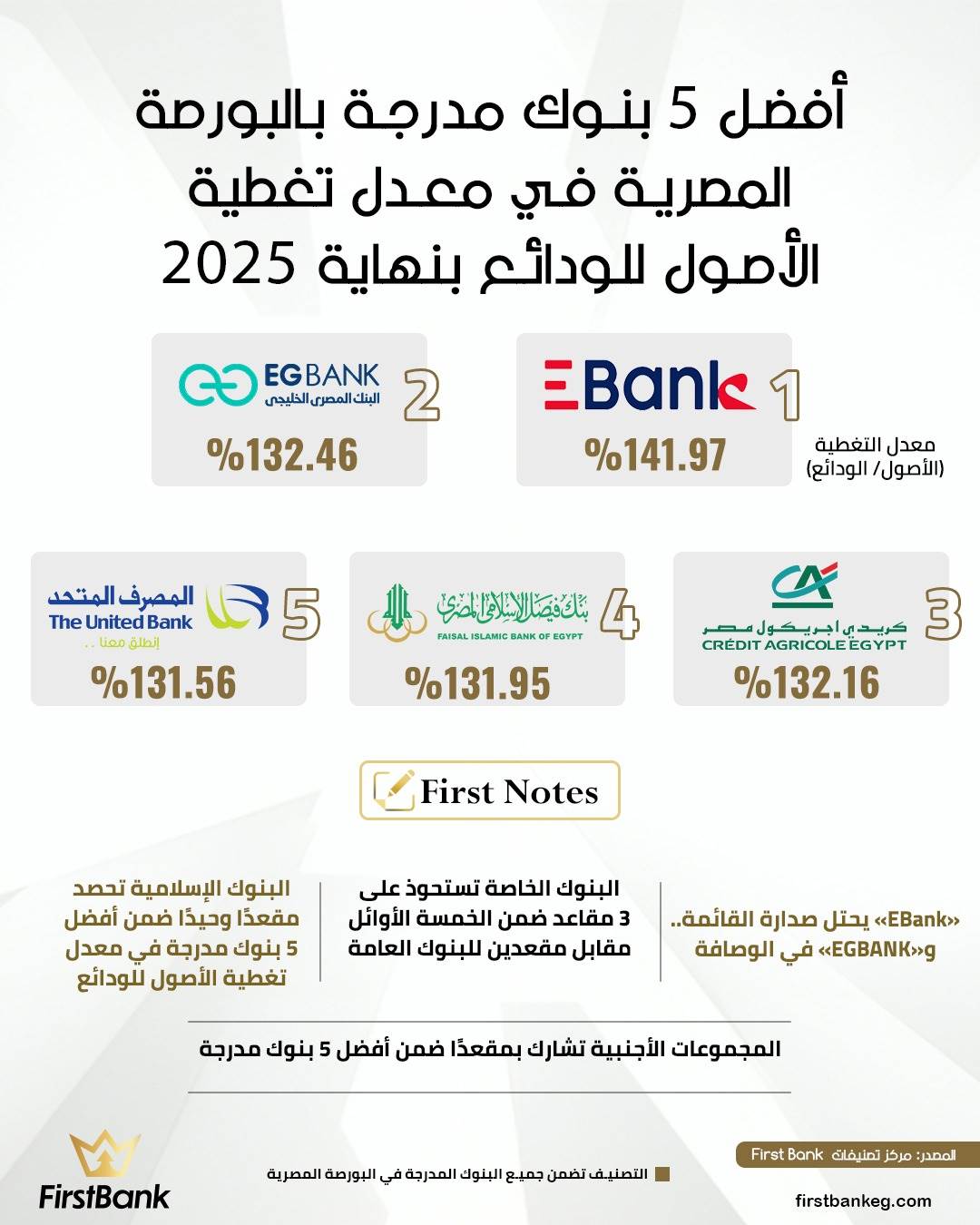 43017 /43017 أفضل 5 بنوك مدرجة بالبورصة المصرية فى معدل تغطية الأصول للودائع بنهاية 2025 مركز تصنيفات First Bank 02:44 م - الثلاثاء 17 مارس 2026 شارك شارك