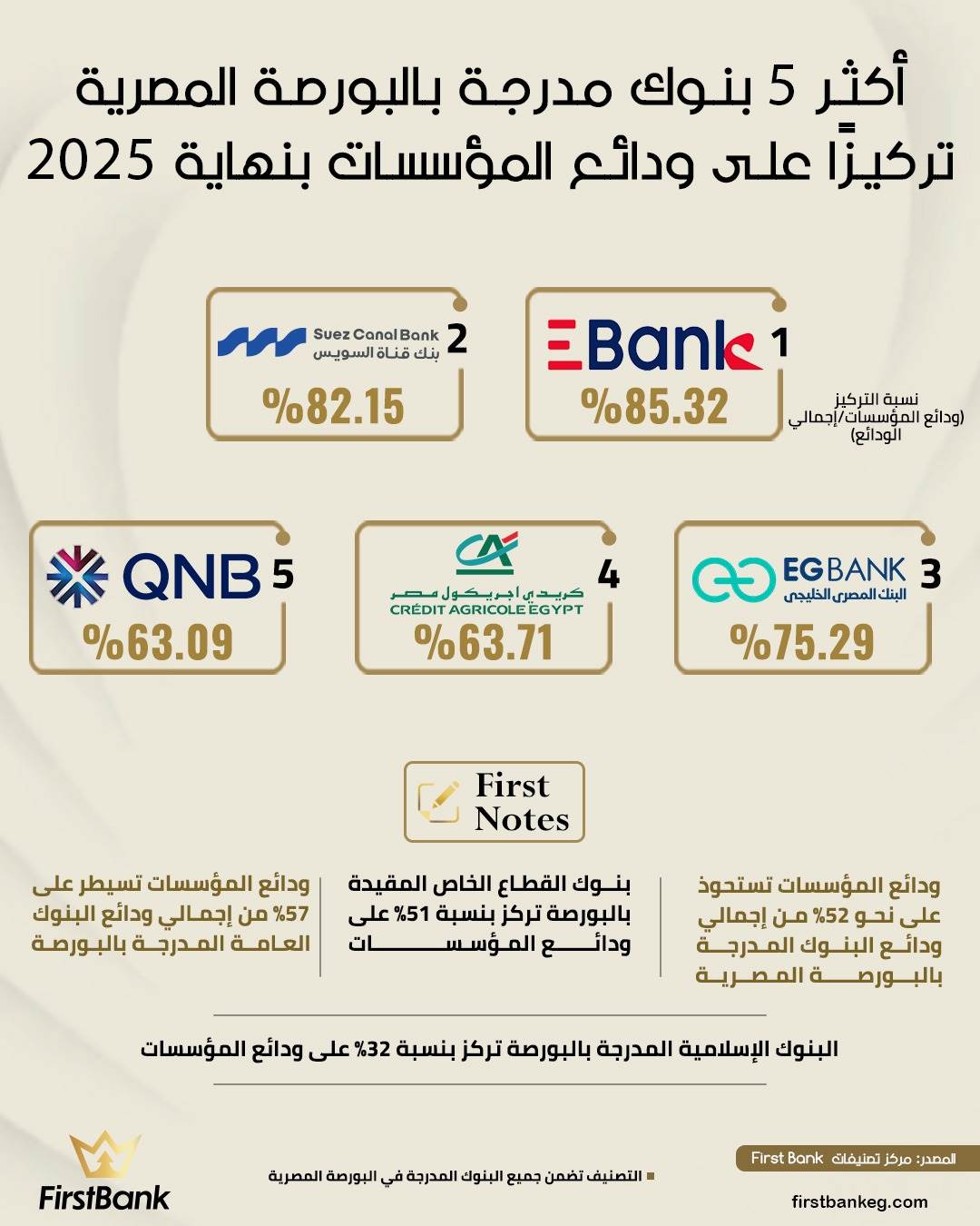 43384 /43384 أكثر 5 بنوك مدرجة بالبورصة المصرية تركيزاً على وادئع المؤسسات بنهاية 2025 مركز تصنيفات First Bank 11:29 ص - الأحد 5 أبريل 2026 شارك شارك
