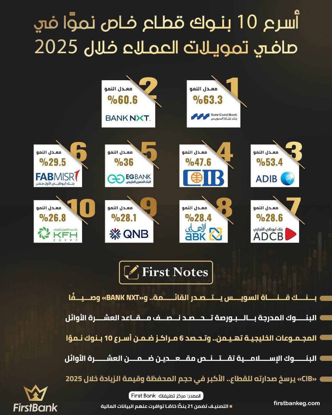 43562 /43562 أسرع 10 بنوك قطاع خاص نمواً في صافى تمويلات العملاء خلال 2025 مركز تصنيفات First Bank 01:37 م - الثلاثاء 14 أبريل 2026 شارك شارك