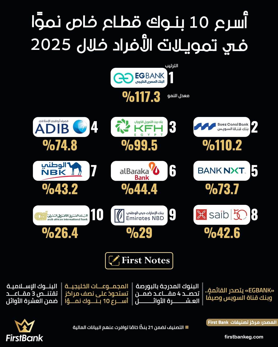 43597 /43597 أسرع 10 بنوك قطاع خاص نمواً في تمويلات الأفراد خلال 2025 مركز تصنيفات First Bank 01:13 م - الأربعاء 15 أبريل 2026 شارك شارك